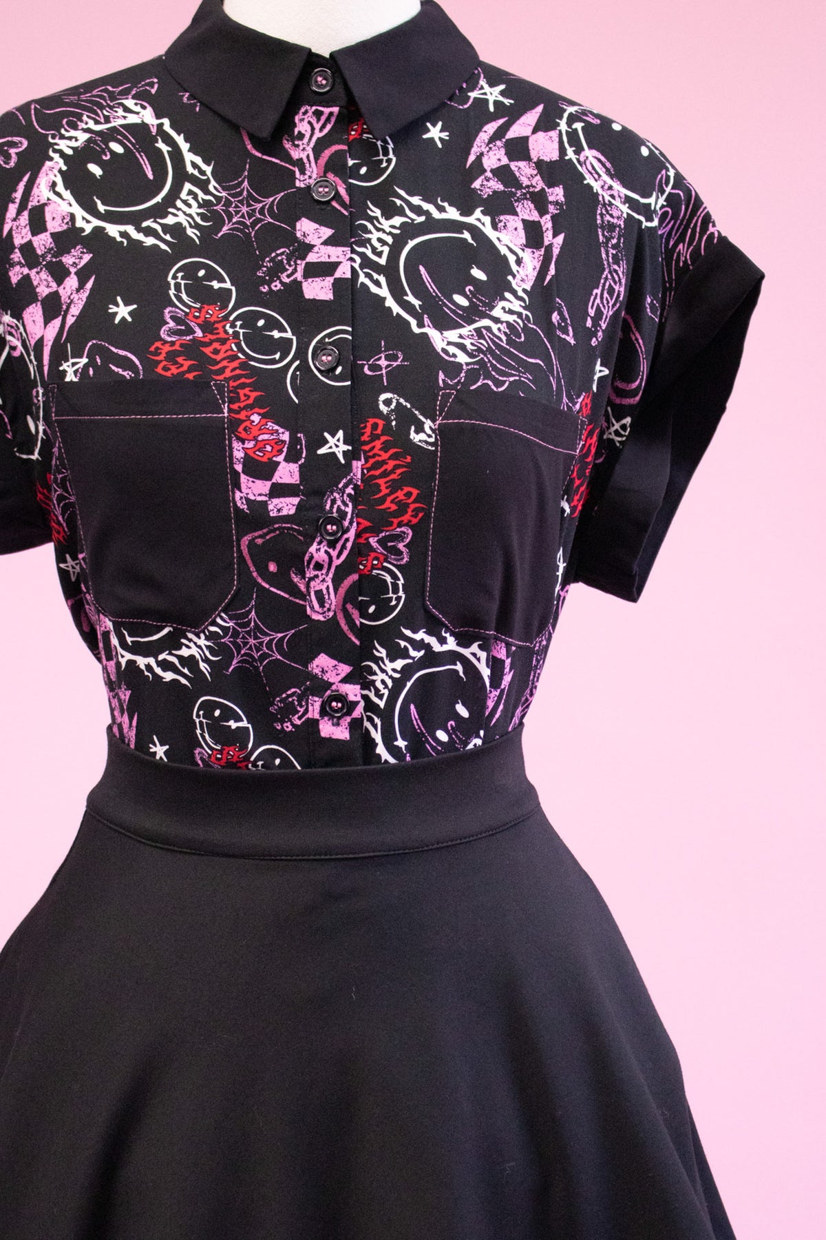Part of Hell Bunny's collaboration with Smiley® Originals, The Riot Shirt! This black shirt is brought to life with intricately illustrated grungy Smiley® motifs in red, pink, and white. The shirt features a statement black pointed collar and rolled cuffs, and matching pockets on the chest are accentuated by contrast pink stitching. A button up placket fastening finishes this statement shirt, making it the perfect addition to your wardrobe!