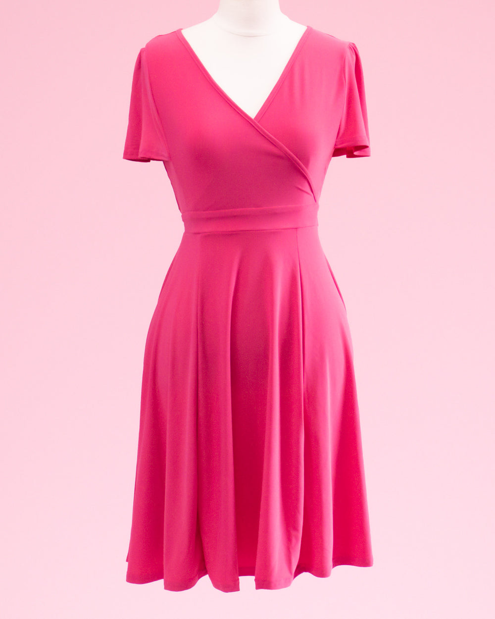 This Lyra dress is soft and flattering in a beautiful stretch material. Wear this dress to work or when off-duty, it's sophisticated enough for any environment! A deep V-neck crossover front adds an alluring edge and a narrow sash tied at the waist accentuates the silhouette. The skirt falls in a soft, full, flared shape, finishing below the knee. Now with Pockets!