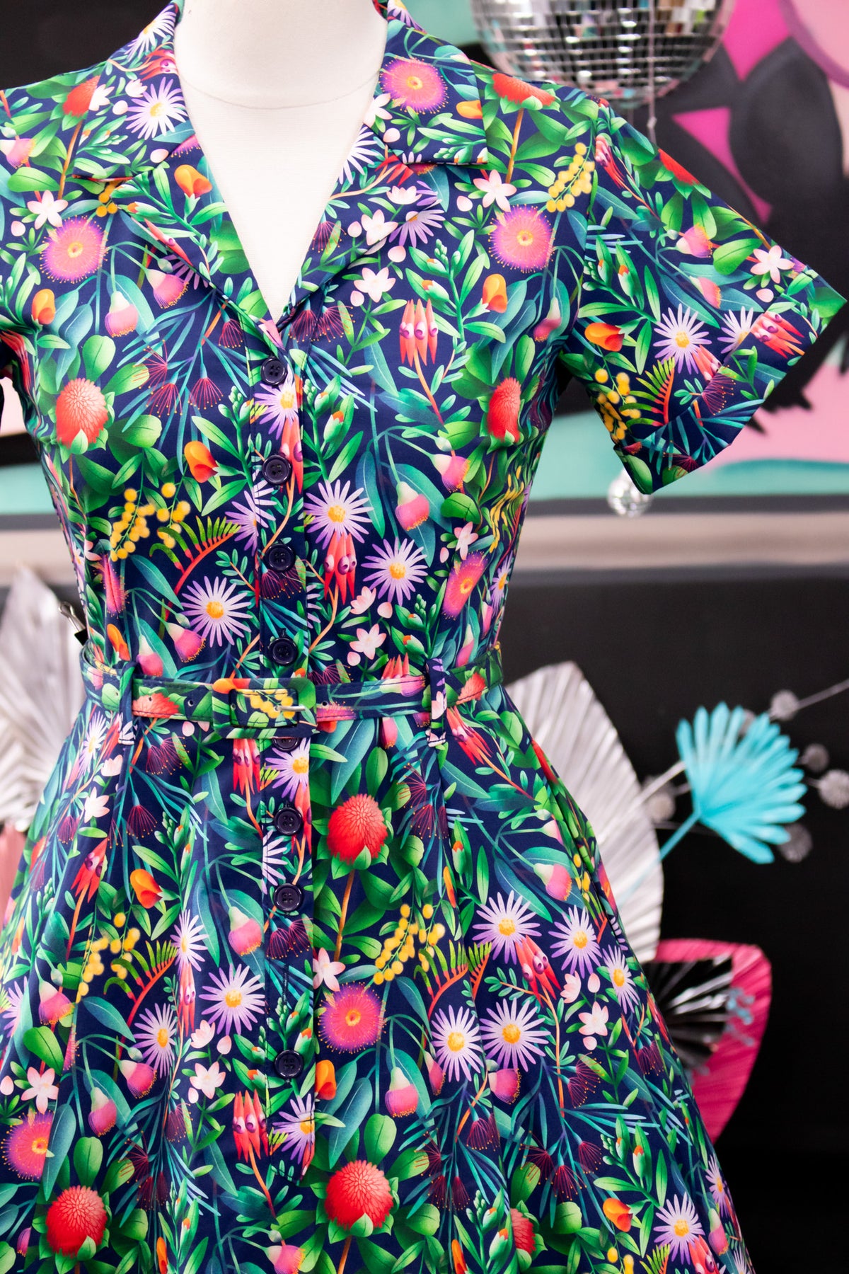 As I unwrapped this beautiful dressd, the colours stood out with the styalised Australian flowers and foliage which were tempered by a midnight navy blue background. All I could think was WOW!