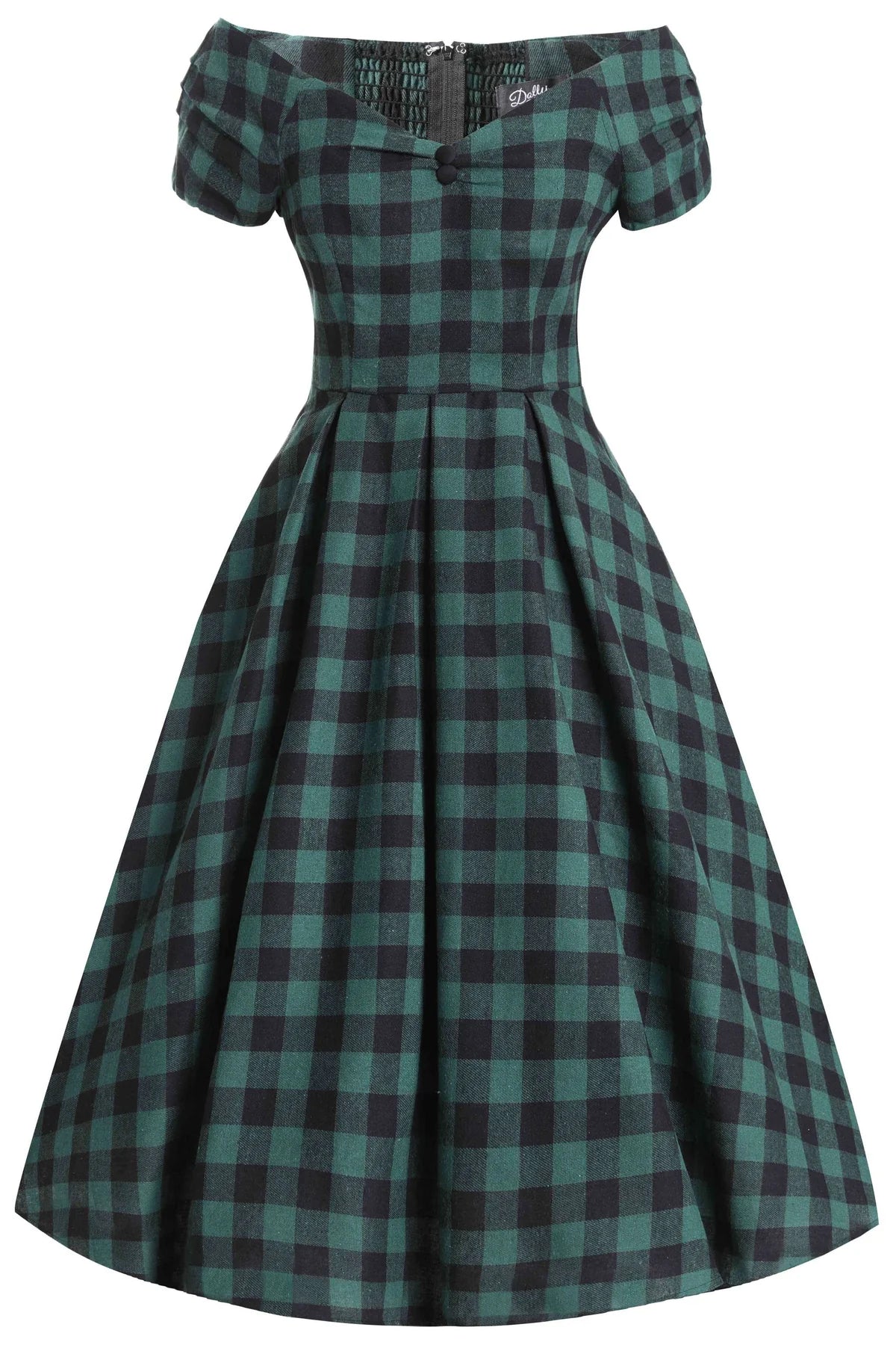 Vintage-inspired swing dress in green and black check pattern. Features a fitted bodice with soft V-neckline, smocked back panel, short sleeves, and a concealed back zip. The pleated skirt creates a classic fit-and-flare silhouette. Made from soft woven fabric for comfort and structure.