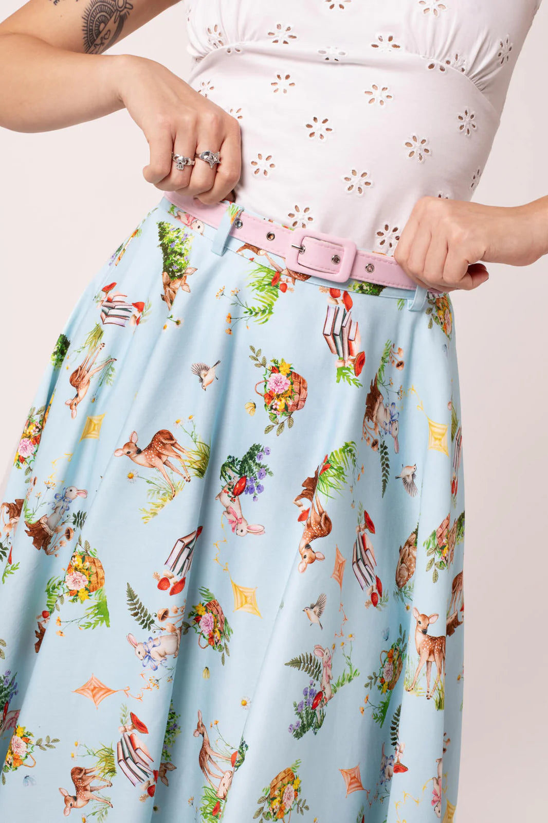 It doesn’t get more adorable than The Beatrix Skirt. This 50’s style, printed cotton skirt features a soft blue base, illustrated with adorable motifs of rabbits, deer, and woodland foliage. A detachable pink belt sits at the waistband to compliment the pink hues of the print. Flowing from the waistband is a full circle skirt, perfect for petticoats, with discreet yet practical pockets in the side seams. Style with The Sammy Jo Top pictured for an effortless Spring look, or mix it up with The Cindy Blouse for a pastel, print-on-print ensemble.
