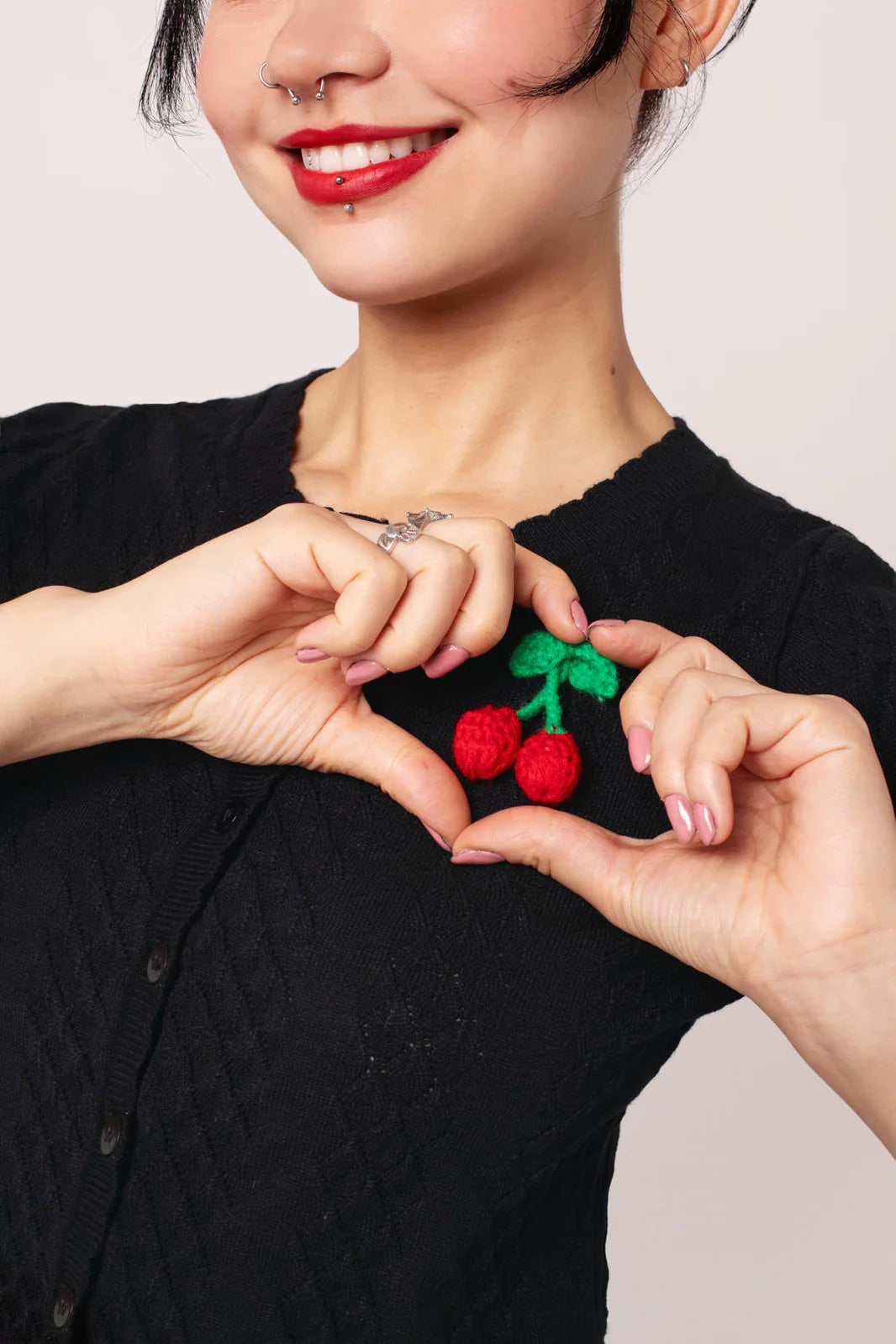 The Claudie Cardigan: the cherry on top of your outfit. This semi-fitted, patterned knit cardigan features a detachable knit cherry brooch to add a sweet touch to the everyday. Style with The Mel Skirt for a vintage, feminine feel, or pair with The Simone Trousers for a retro workwear look.