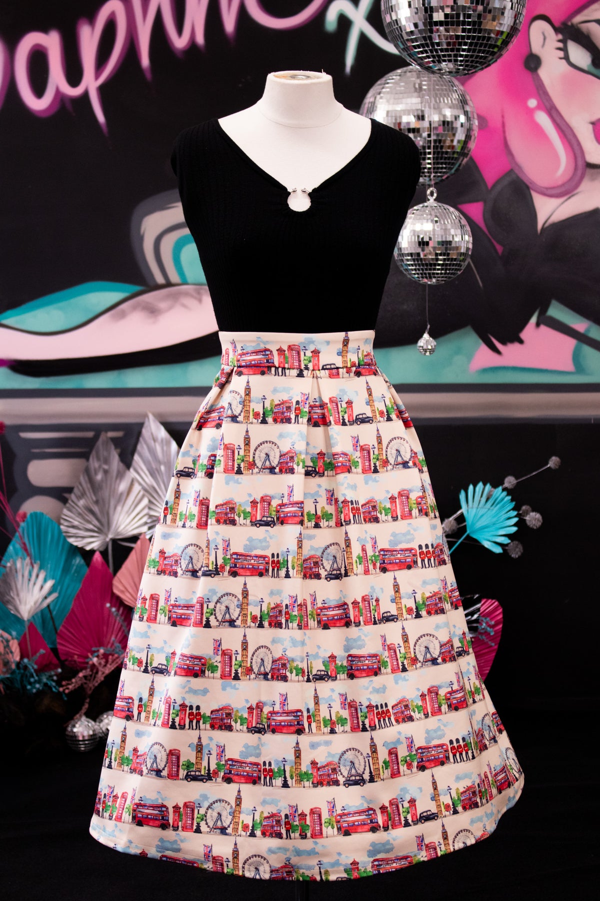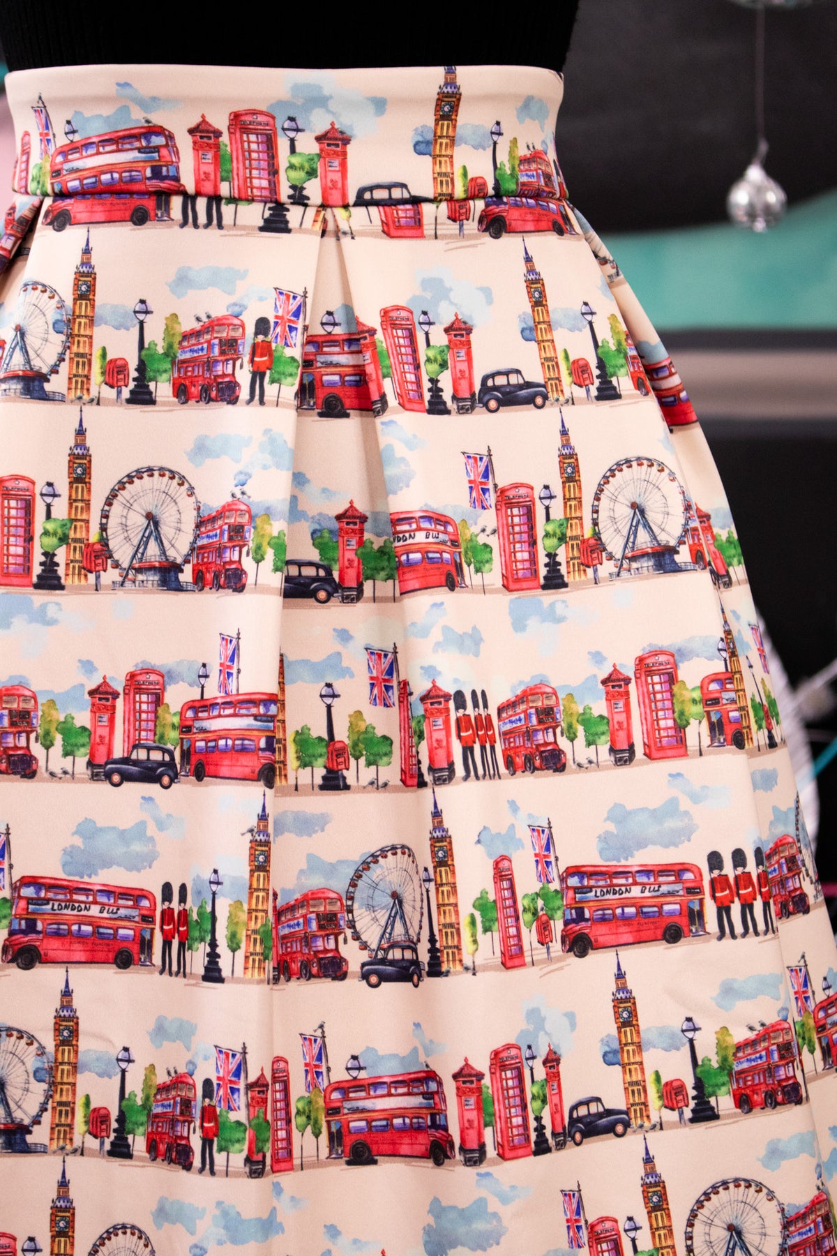 Celebrate iconic city style with the Aisley London Pleated Midi Skirt. Set against a crisp white backdrop, this charming design features illustrated landmarks of London, from Big Ben and the Tower Bridge to classic red buses and telephone boxes. The high-waist fit and full pleats create a flattering, flowing silhouette, while the side pockets add a practical touch. Perfect for travel lovers, Anglophiles, or anyone who enjoys playful city-inspired fashion, this skirt is a fresh and eye-catching addition to any wardrobe.
