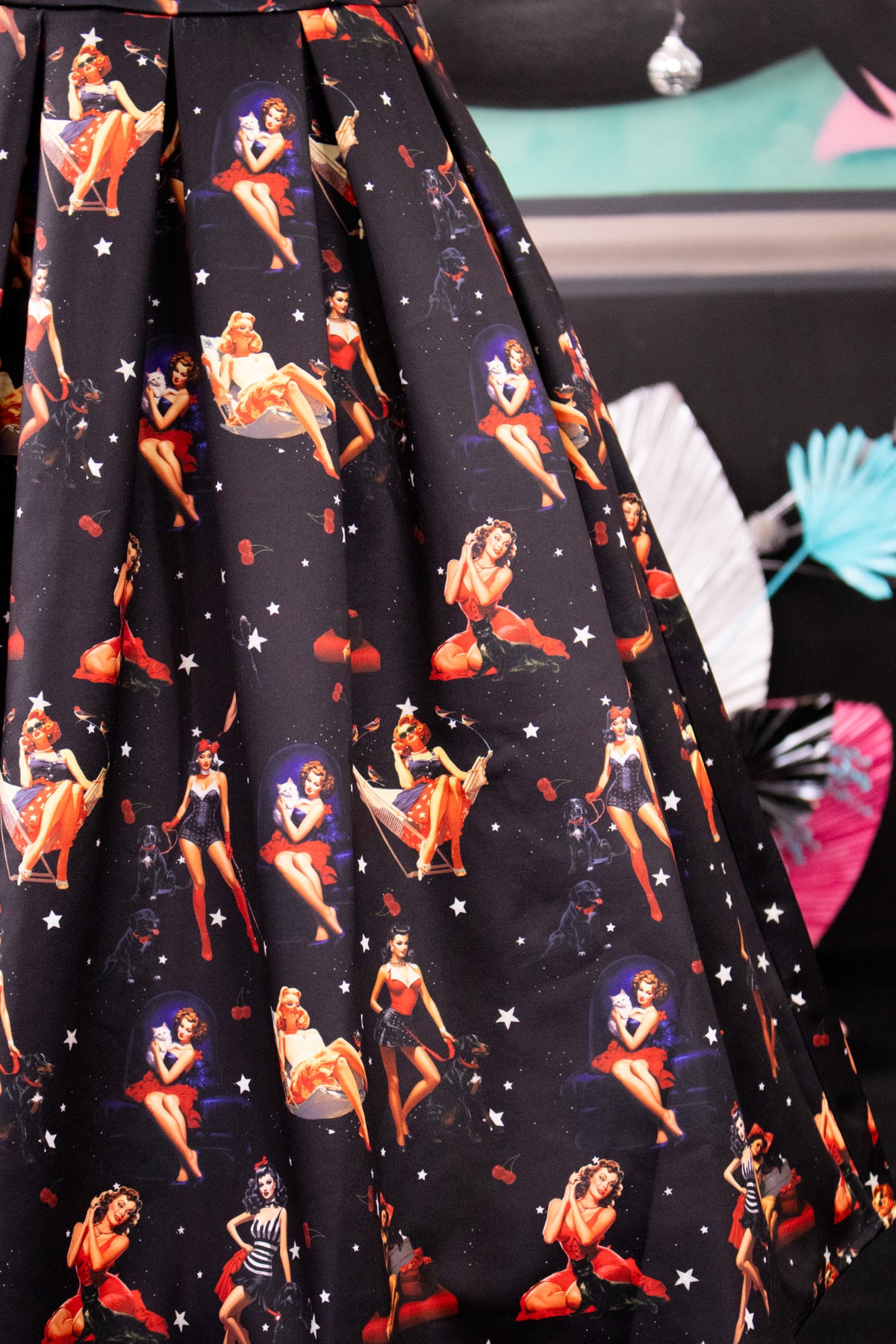 This retro frock features a lovely flattering fitted bodice, a scoop neckline, and a 50s swinging skirt with box pleats. The Amanda dress is made from super soft-touch polyester with stretch. It features 2 side-hidden pockets and a hidden back zip.