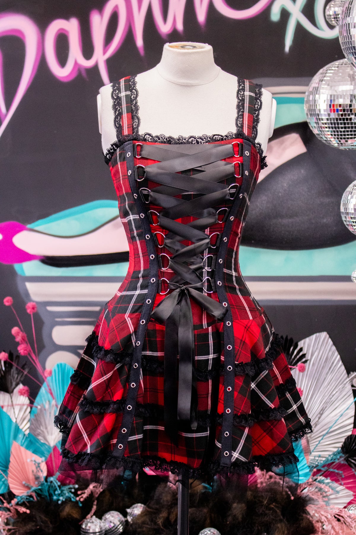 This punk style, classic pinstripe dress features corset-style lace-up detailing at the front, with a 3 tiered skirt for drama. Black lace trim decorates the straps, neckline, and skirt layers. The wide shoulder straps can be adjusted with buttons at the back, and a shirred elastic panel in the back adds extra stretch and comfort. The Harley Dress will make you feel like a punk princess!